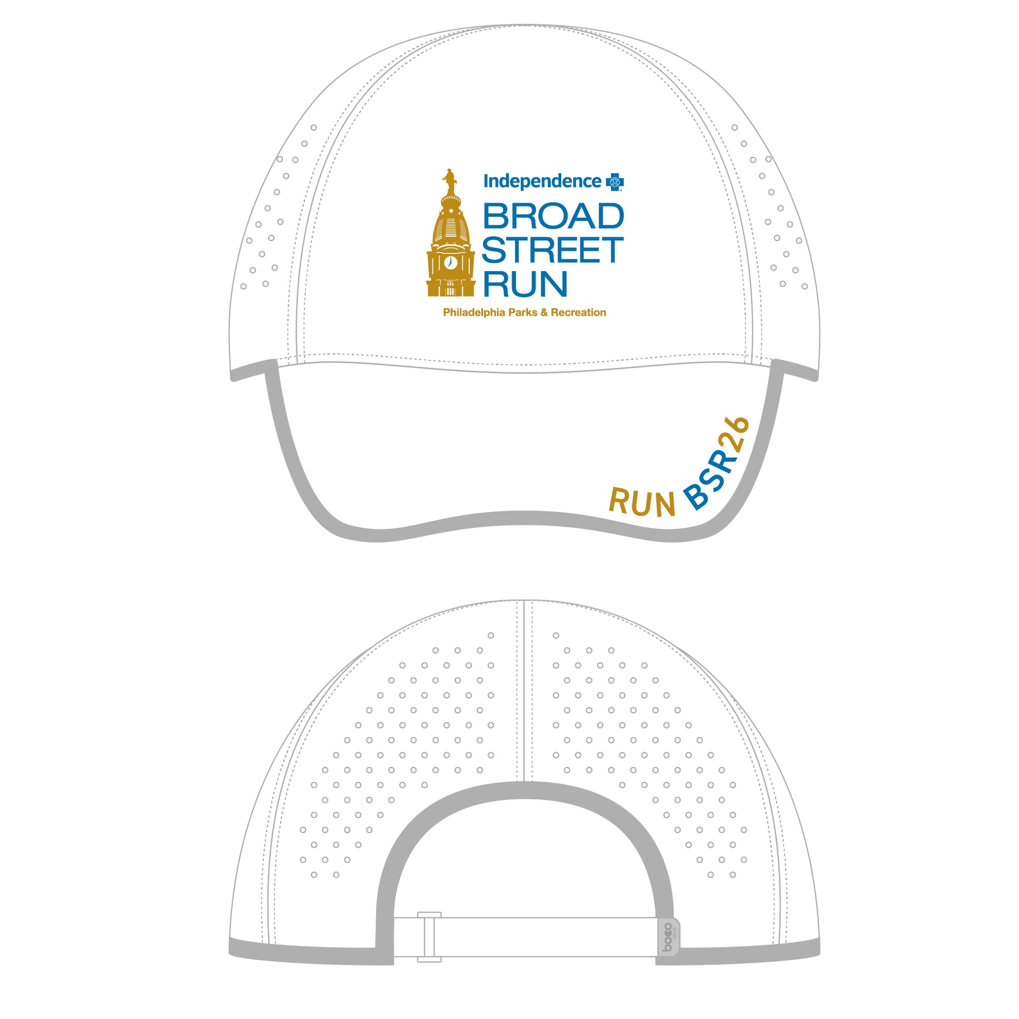 Broad Street Run Headwear. Lightweight wicking woven poly panels with Dry Tech mesh side panels; soft poly mesh wicking sweatband; adjustable back snap buckle; black underside bill to reduce glare; curved bill; machine washable. From Boco. Item ID bsphC238